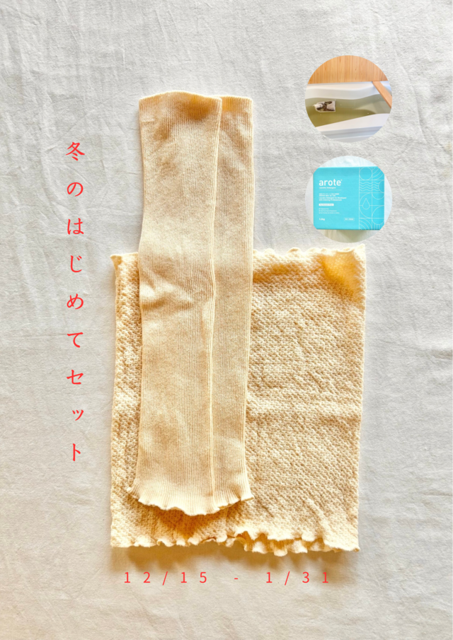 しぜんと私 の商品を 試してみたい方へ向けて ' 冬のはじめてセット ' を販売いたします 期間 : 12/15 - 1/31 しぜんと私 蔵 . オンラインストアにて ⚪︎リブ編み レッグ&アームカバーセット ・リブ編み レッグ&アームカバー ・草木湯(お家用)1袋 ・洗濯洗剤 arote サンプル30g 「オーガニックコットン + びわの葉と丁子染めの肌着」 体の中の不要なものを やさしく出していく ただただ 心地よい肌着 「草木湯」 お家のお風呂でびわの葉と丁子の おもいやりに包まれる 芯からあたたまり よき眠りのお供に 「arote®︎」 界面活性剤フリーの優しくもパワフルな洗剤 肌着にももちろん 人体に 環境に やさしいのです しぜんと私のエッセンスが詰まった セットをご用意いたしました はじめての方も そうでない方も おくりものにも ぜひ ◯ 「リブ編み レッグ&アームカバー」 色 : キナリ サイズ : フリー 長さ 約40㎝ 素材 : 綿100%(オーガニックコットン) 別途ゴム糸使用 染め : びわの葉 . 丁子 生産 : 日本 「草木湯」 原材料 : びわの葉 . 丁子 内容 : 20g×1袋 「arote®︎」 正味量 : 30g 成分 : アルカリ剤(炭酸ナトリウム、重炭酸ナトリウム(重曹))・水軟化剤(クエン酸ナトリウム)・分散剤・再汚染防止剤(カルボキシメチルセルロース)・酵素